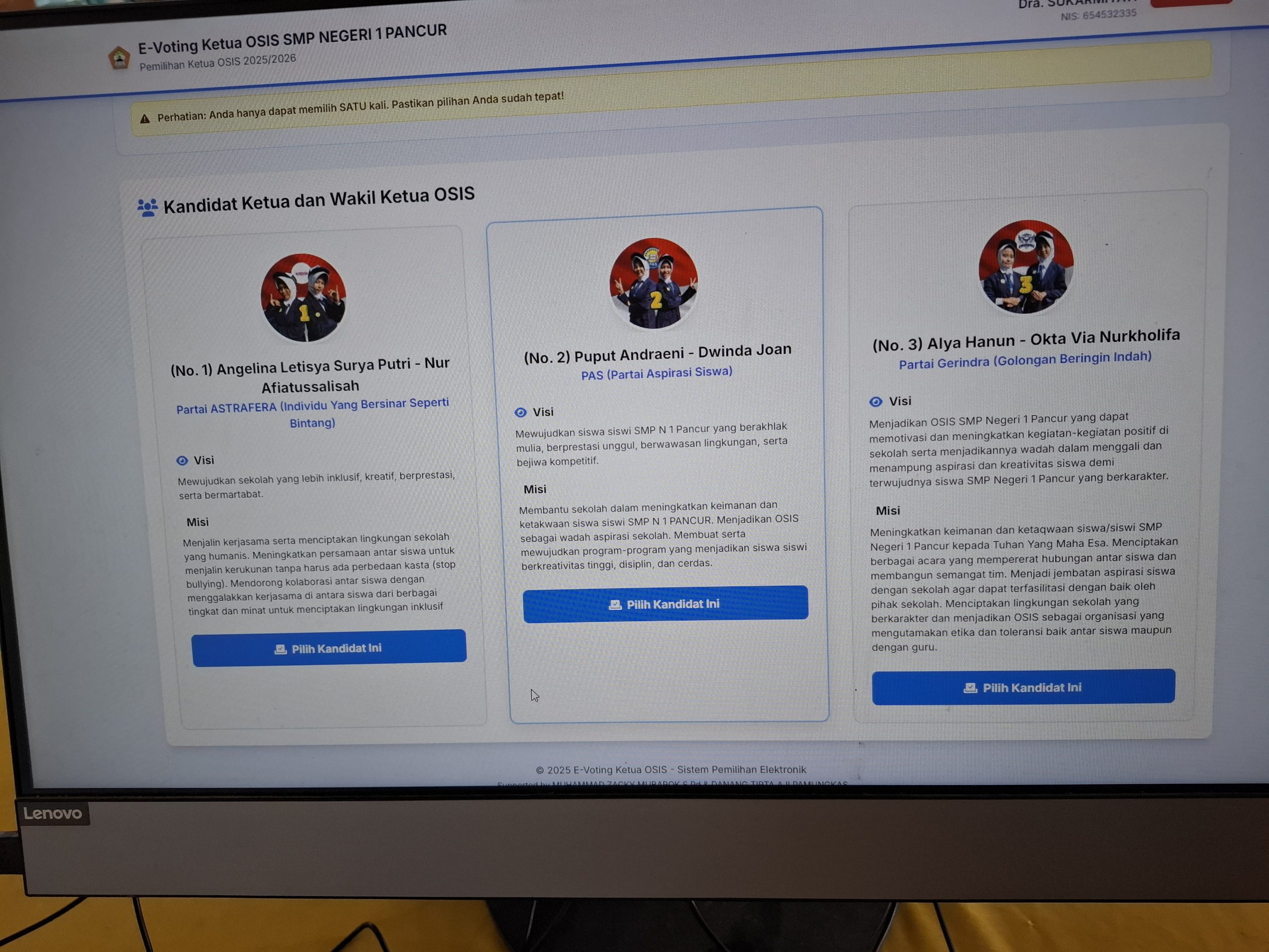 “Selama ini setiap pemilihan OSIS selalu menghasilkan tumpukan kertas yang akhirnya jadi sampah. Dengan sistem digital, kita tidak hanya membuat proses lebih cepat dan transparan, tapi juga mendukung visi sekolah sebagai Adiwiyata Nasional. Anak-anak jadi belajar demokrasi sekaligus belajar menjaga lingkungan,” ujarnya.